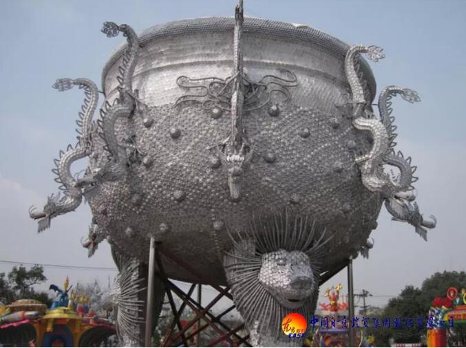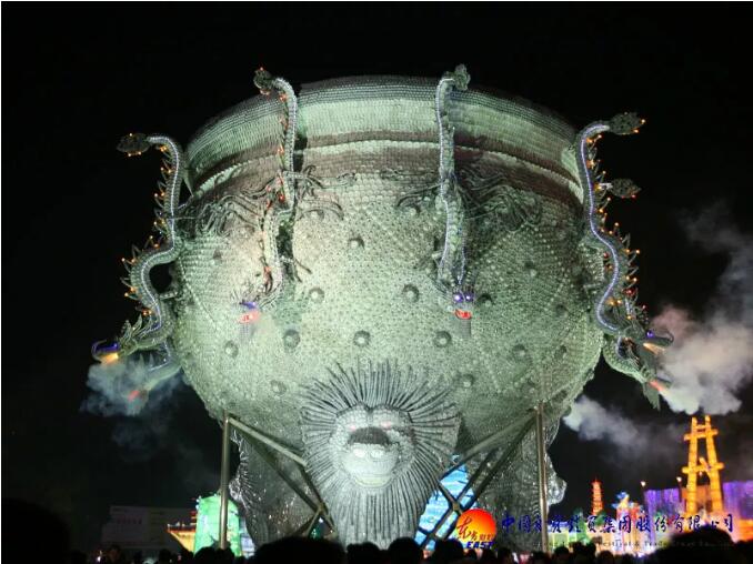 東方彩燈精心設計制作的“九龍鼎”燈組采用景德鎮(zhèn)青花玲瓏瓷具杯、羹、匙、盅、盤、碟、碗等近30萬件手工捆扎而成,主體為鋼結構;鼎高和直徑均為18米,最大處直徑26米,總重近100噸。
