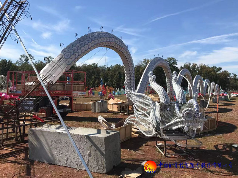 《中華瓷龍》燈組最具有文化代表性,龍是中華民族的圖騰,被賦予了強(qiáng)烈的漢民族人文氣息,而青花瓷又是中華陶瓷燒制工藝的致臻之作,代表著精湛的中國工藝智慧,兩者的碰撞交融,采用鋼骨架結(jié)構(gòu)與瓷器捆扎工藝技術(shù),頂部球泡變光和外光源的使用,在夜幕下,仙氣環(huán)繞,猶如神龍出海,威武挺拔,熠熠生輝?!吨腥A瓷龍》從瓷器采購、半成品、包裝、運(yùn)輸、再制作等每一個(gè)環(huán)節(jié)都要求精益求精,任何一個(gè)環(huán)節(jié)的失誤都會(huì)導(dǎo)致失敗,技術(shù)難度之大可想而知,同時(shí)耗用各種規(guī)格青花瓷器上萬件,再加上幾十位工匠師傅的縝密做工,最終向大家呈現(xiàn)出一幅純手工制作的超大瓷龍畫卷。