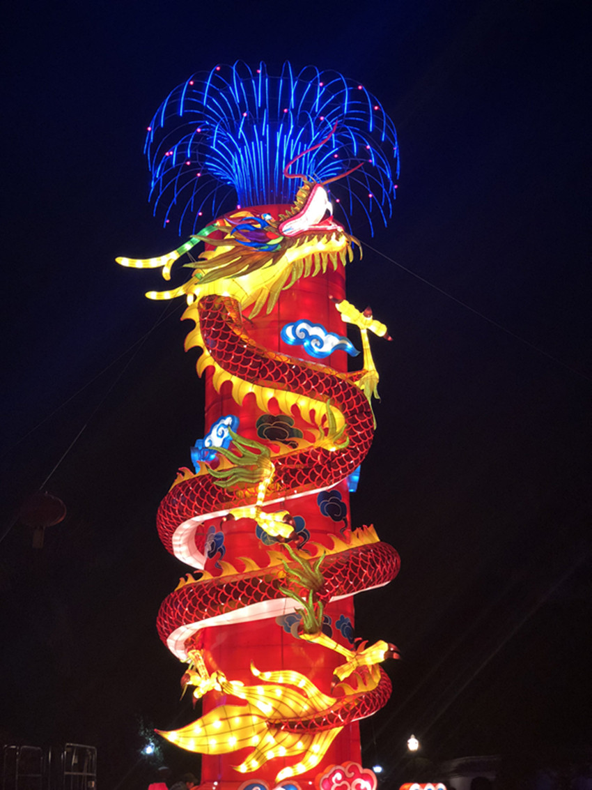 16米高的《龍柱禮花》,用中國傳統(tǒng)瑞獸龍為設(shè)計主題,繞柱而上,造型獨特,寓意鵬程萬里。