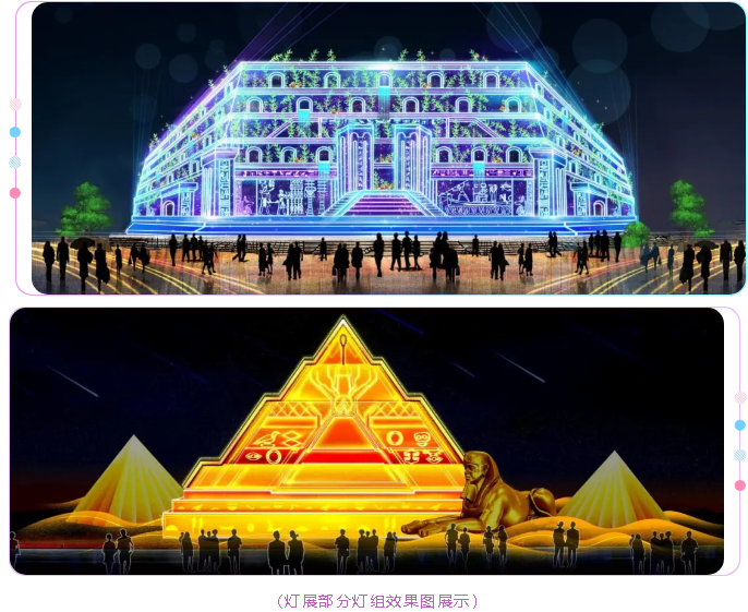 由自貢燈貿(mào)集團(tuán)股份有限公司承制的“桔橙光影 大雅丹棱”燈光節(jié),以“北緯30度,世界最神奇的存在”為主線,情景展開這一緯度上的奇觀絕景和神秘文化。精湛的彩燈工藝和現(xiàn)代光影技術(shù),散發(fā)著異乎尋常和夢幻的光影色彩,為游人展示北緯30度各國的文化表情和最璀璨的古老文明。