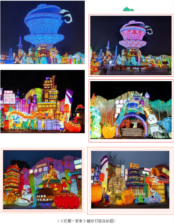 由燈貿(mào)集團(tuán)創(chuàng)意、設(shè)計(jì)團(tuán)隊(duì)等數(shù)百名彩燈匠人歷時(shí)兩個(gè)多月精心打造的《巴蜀一家親》、《自貢記憶》、《五糧液》三個(gè)大型燈組。《巴蜀一家親》薈萃川渝各城風(fēng)貌之靈光,主體以獨(dú)具特色的川渝茶文化代表——蓋碗茶為載體,現(xiàn)代透光材質(zhì)制作憨態(tài)可掬的熊貓,下方高鐵環(huán)繞而行,輔以巴蜀特色元素,將自貢傳統(tǒng)彩燈制作工藝與新技術(shù)相結(jié)合,為游客帶來(lái)可看、可聽(tīng)、可聞的沉浸式的觀燈體驗(yàn)。