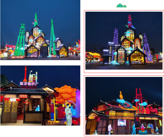 《五糧液》主燈組采用第八代五糧液酒瓶運(yùn)用自貢彩燈傳統(tǒng)工藝?yán)υ删扌臀寮Z液,輔以仙山、仙境、巨龍騰越氛圍闡釋五糧傳奇,杯酒時(shí)光,百年味道。周邊群燈組展示封存在時(shí)光中的“活窖池”--利川永、張萬(wàn)和、劉鼎興、天賜福、聽(tīng)月樓、全恒昌等八家明代釀酒作坊,歷史悠久的古窖池群講述著傳承幾百年的五糧液釀酒工藝,折射幾千年氤氳酒香的中國(guó)酒歷史和酒文化。