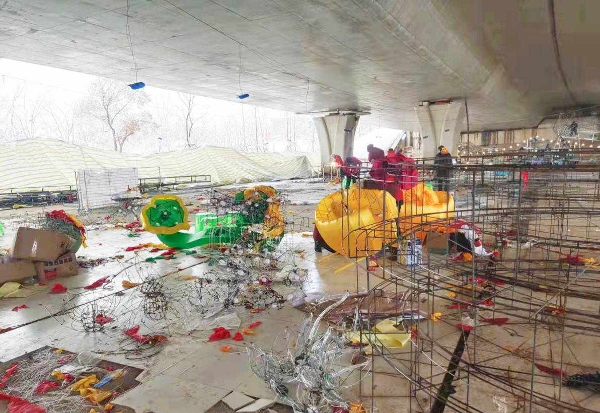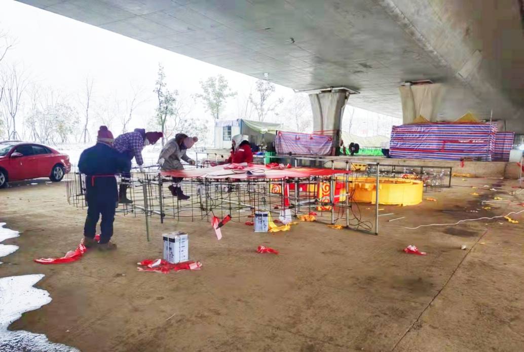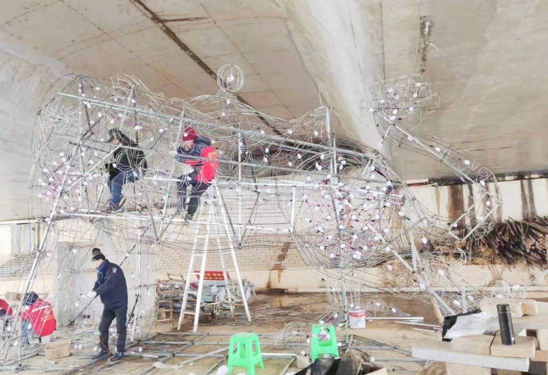 燈貿(mào)集團(tuán)燈組制作團(tuán)隊(duì)從春節(jié)前就已入駐現(xiàn)場。在有限的工期里,幾十名彩燈工匠全天無休,從設(shè)計(jì)、放樣、修改、手工裱糊到組裝焊接,每一個(gè)步驟都精雕細(xì)琢。