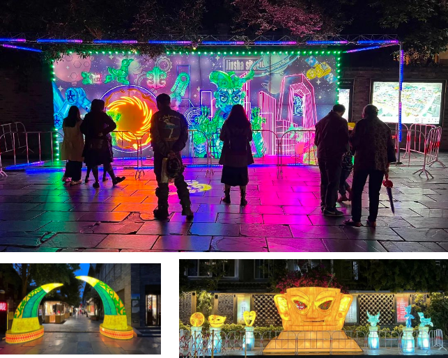 滿繪彩色圖案的金沙象牙燈組、文物造型設(shè)計(jì)燈組《嗚嚕嚕》,演繹著傳統(tǒng)文化的“國潮”新風(fēng)尚,彰顯著文創(chuàng)帶給這座城市的新鮮感和創(chuàng)造力。分布在寬窄巷子景區(qū)燈組,讓游客一腳踏入光影幻境中的古蜀王國。