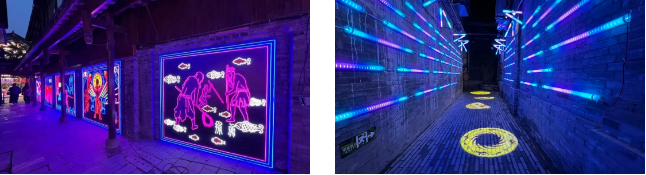燈展還利用寬窄巷子獨(dú)特的建筑形式,在“寬徑”兩邊的墻壁上,用光雕、LED、互動(dòng)投影等形式打造了長達(dá)80米的“時(shí)間長廊”。隨著游客參觀的腳步,古蜀人祭祀、漁獵、制陶、冶金、治玉等生活片段如連環(huán)畫般漸次出現(xiàn)。