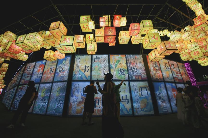 本次燈會(huì)刮起濃濃“國(guó)潮風(fēng)”。燈會(huì)入口是一座中式建筑風(fēng)格的迎賓門(mén),長(zhǎng)達(dá)50米的迎賓廊道掛滿燈籠,市民游客穿行其間,恍如置身漢唐;十二生肖彩燈俏皮靈動(dòng),精致絢爛;百余句經(jīng)典詩(shī)詞點(diǎn)亮道旁樹(shù)木;百家姓燈籠組成長(zhǎng)龍,中華傳統(tǒng)文化韻味十足。