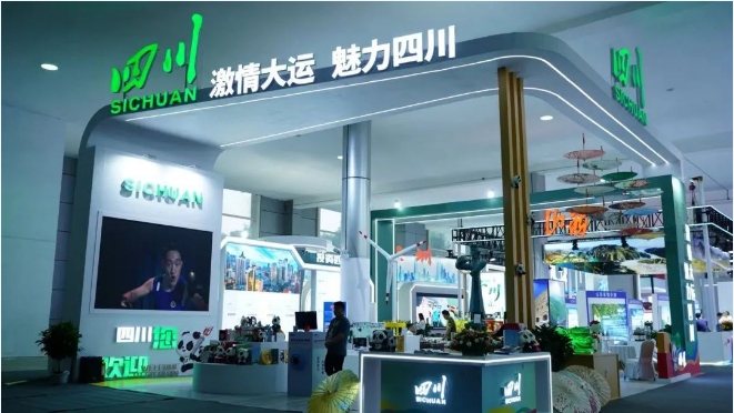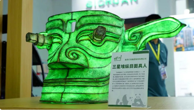本屆青洽會中,四川館以“激情大運·魅力四川”為主題,分設“激情大運”“特色科技”“三星堆文創(chuàng)”“川貨出川”四大展區(qū)。自貢燈貿(mào)集團股份有限公司的最新微縮彩燈工藝產(chǎn)品——“三星堆縱目面具人”亮相青洽會,攜手其他特色文創(chuàng)展品共同生動展現(xiàn)四川風采。